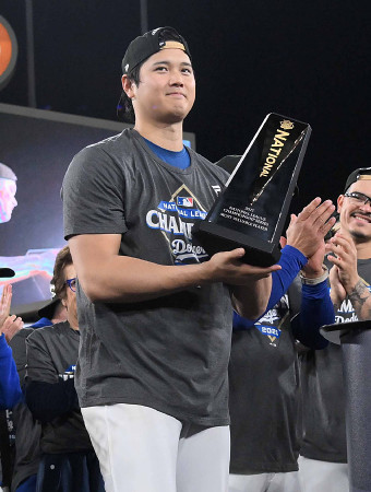 ドジャースの大谷は1番投手兼指名打者で出場し、初回先頭を含む3本塁打。投げては7回途中無失点、10奪三振の力投で勝利投手となり、リーグ優勝決定シリーズの最優秀選手(MVP)に選ばれた=17日 【時事通信社】