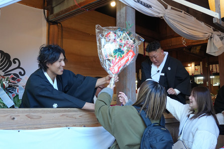 435年の歴史を持つ十日恵比須神社(福岡市博多区)で8日、新年の商売繁盛などを祈願する祭り「正月大祭」が始まった。祭りの名物福引では、参拝客へササと熊手や小づちなどの縁起物が授与された。 【時事通信社】