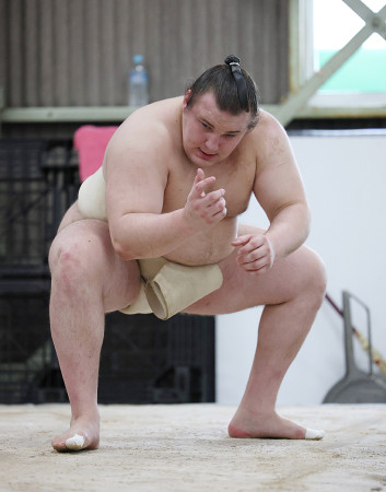 3月の大相撲春場所で横綱昇進に挑む大関安青錦が25日、大阪府松原市内にある安治川部屋の稽古場で四股やすり足などの基礎運動を行い、汗を流した。 【時事通信社】