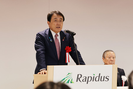経済産業省は11日、最先端半導体を開発中のラピダスに6315億円を追加支援することが決まったと発表した。写真はラピダスの半導体解析施設の開所式であいさつする赤沢亮正経済産業相=同日、北海道千歳市 【時事通信社】
