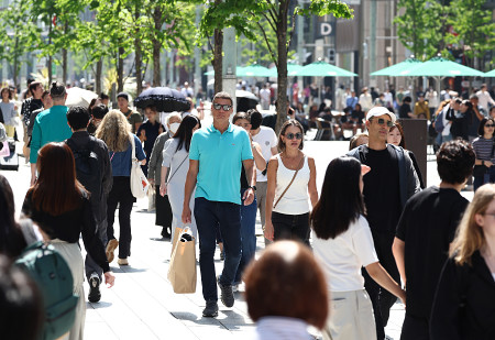 11日、気象庁によると東京都心では午後1時に26.7度を記録し今年初めての夏日になった。銀座周辺では半袖姿で歩く人の姿も見られた。 【時事通信社】