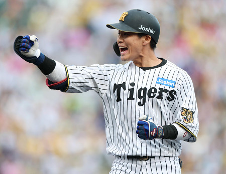 阪神が競り勝った。1点を追う7回、森下と木浪の適時打で2点を挙げて逆転し、継投で逃げ切った。写真は7回、勝ち越し適時打を放ち、喜ぶ木浪=18日、甲子園 【時事通信社】