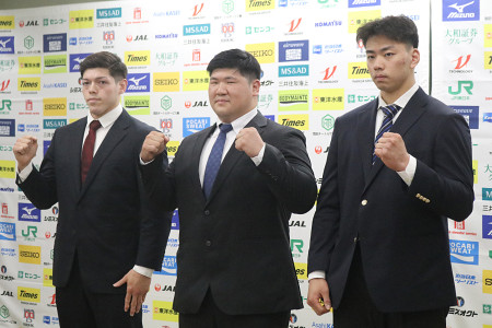 体重無差別で日本一を争う柔道男子の全日本選手権(26日、日本武道館)に出場する選手が25日、東京都内で記者会見に臨んだ。写真は撮影に応じる昨年覇者の香川大吾(中央)。左は村尾三四郎、右は新井道大。 【時事通信社】