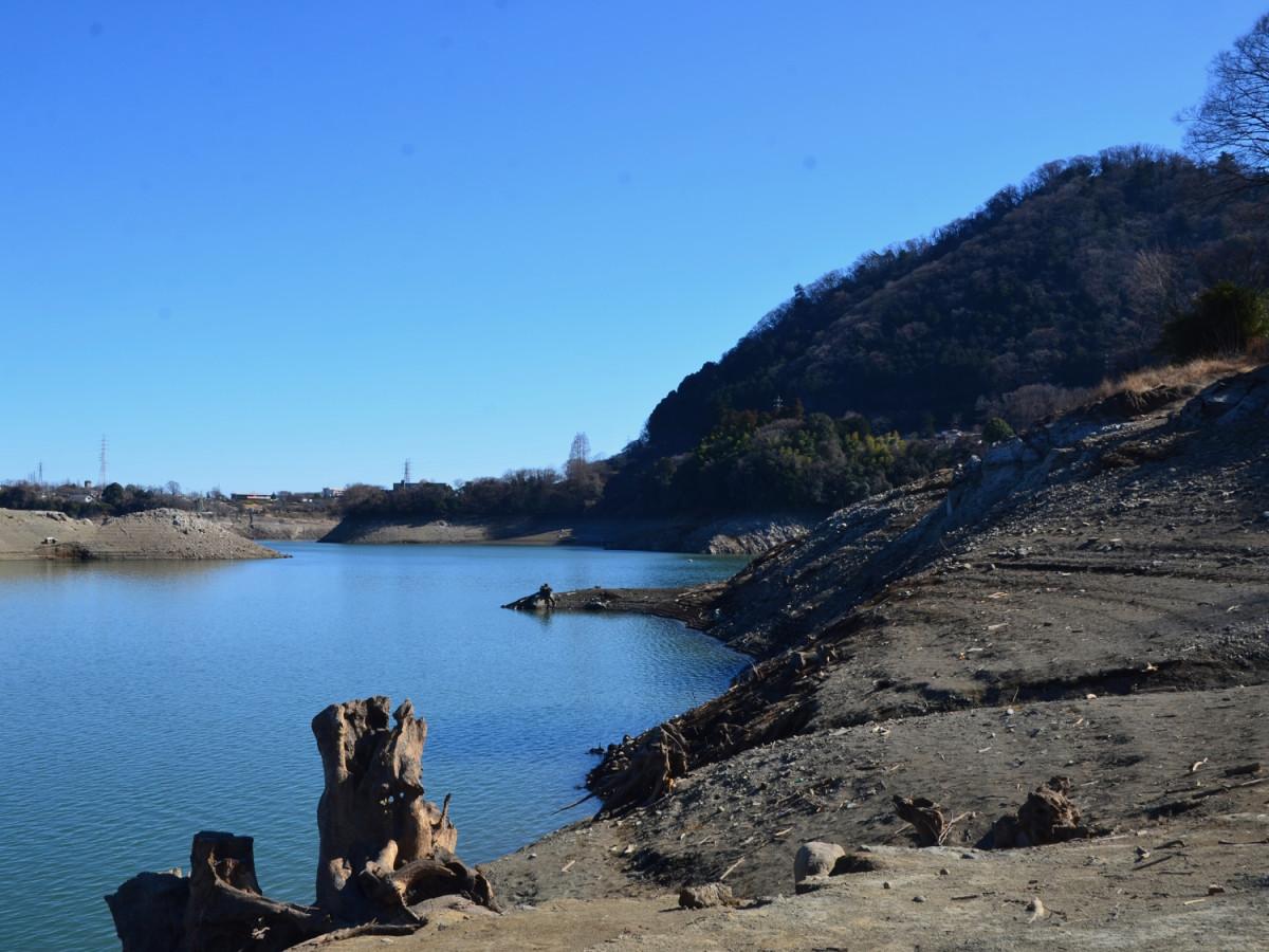 記録的な少雨の影響により、相模川水系のダム湖で貯水率が著しく低下し、普段は水底に沈んでいる光景が姿を現している。